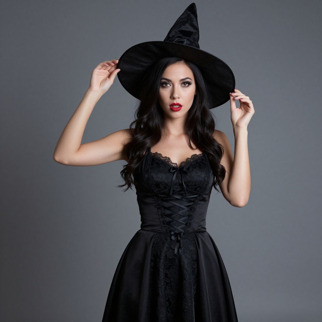 Photograph of a fair-skinned woman with long, wavy black hair and striking blue eyes, wearing a black witch hat and a black lace-trimmed, corset-style dress. Her makeup is bold, featuring red lipstick and dark eyeliner. She holds the brim of her hat with both hands, striking a confident pose. The background is a solid, muted gray, highlighting her dark attire. The image has a studio-quality, high-contrast finish, emphasizing her elegant and mysterious witch-like appearance.