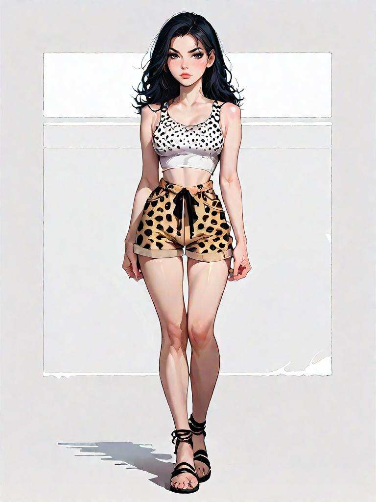 1girl, source_comics, realistic face, full body shot, Woman, contemporary casual, peplum-style top in dark green, sleeveless with scoop neck and keyhole detail, defined waistline with ruffled hem, paired with burgundy cropped trousers, accessorized with leopard print shoulder bag, white background