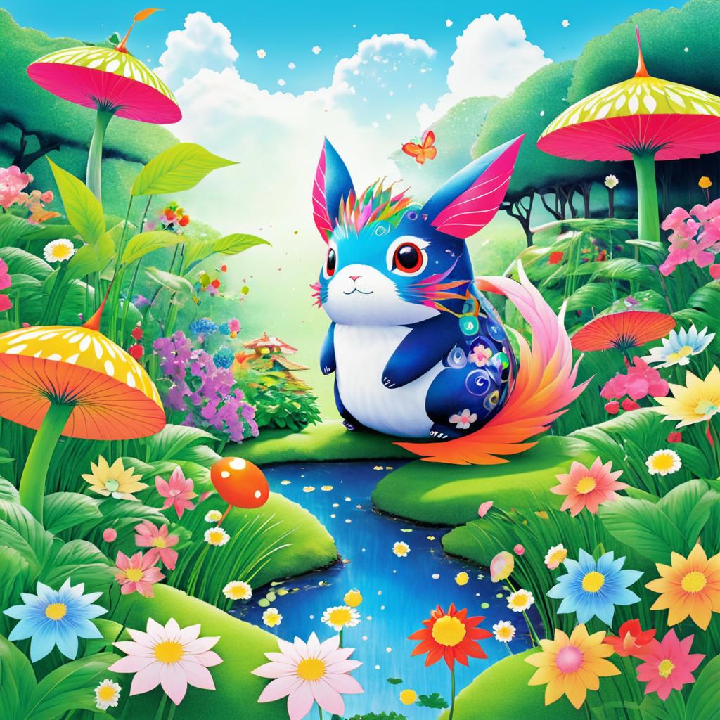 Bright manga-style artwork featuring a whimsical, multicolored rabbit with intricate patterns sitting in a vivid garden. Surrounded by oversized, colorful flowers, large blue and orange mushrooms, and lush green bushes under a clear blue sky with fluffy clouds. The scene includes vibrant orange and pink autumn trees, contributing to the enchanting atmosphere.