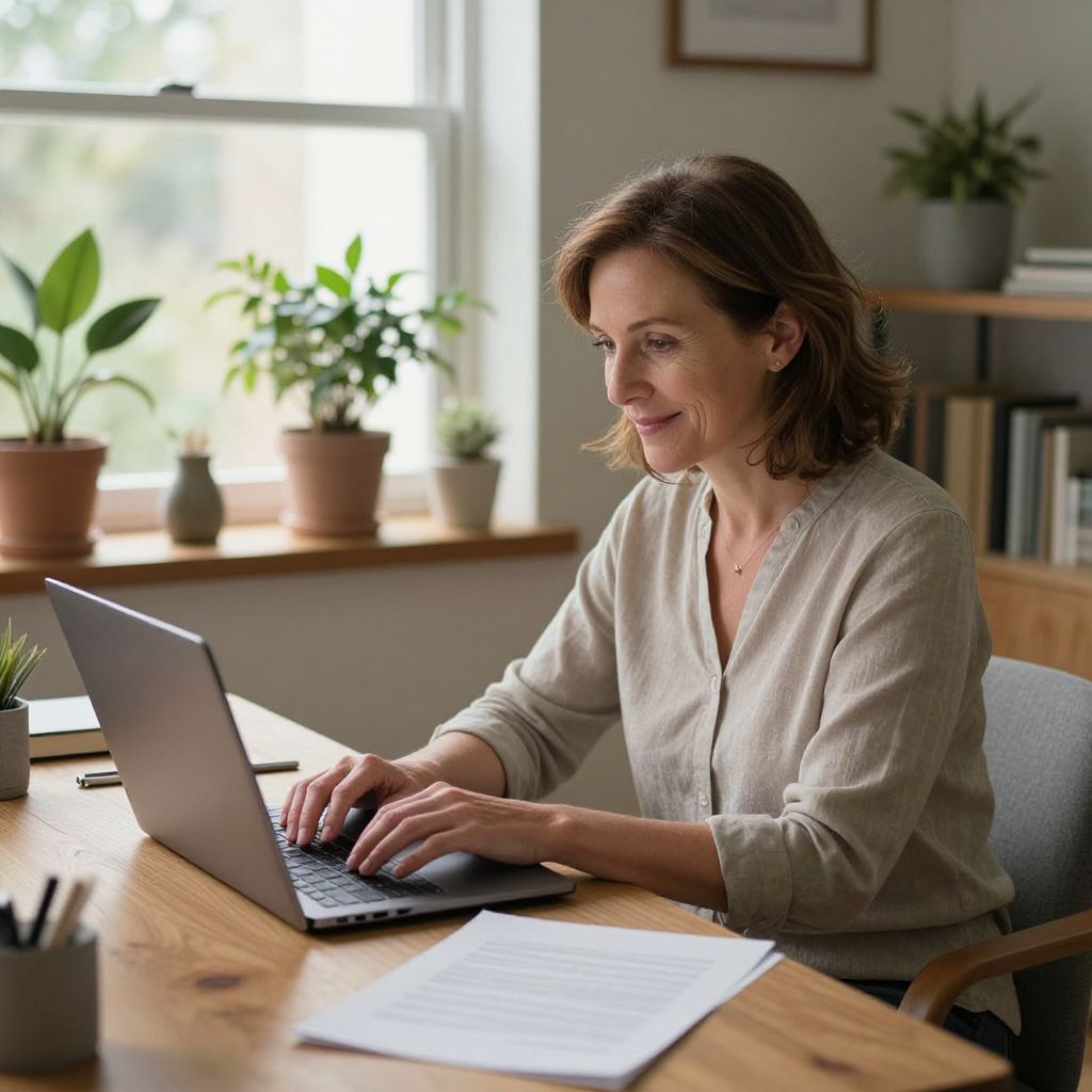 Middle-aged woman seated comfortably in a cozy home office, smiling while typing on a sleek silver laptop placed on a wooden desk, surrounded by soft natural light filtering through a window adorned with potted plants.