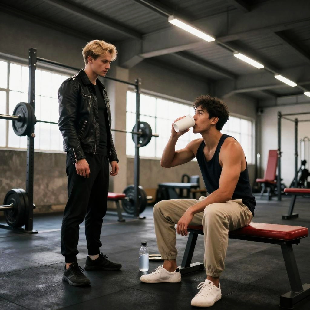 Photograph of two men in an industrial gym. One man with short blond hair in a black leather jacket stands, looking at the other. Second man with dark hair, tank top, and beige pants sits on a red bench, drinking from a white cup. Weight rack with barbells and a water bottle on the floor. Bright industrial lights, barred windows in the background.