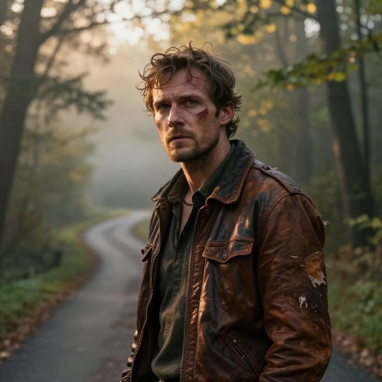Depict a hyperrealistic cinematic portrait of a solitary traveler with rugged features and a prominent scar on their left cheek. Their intense gaze reflects a blend of hope and weariness as they stand at a crossroads in misty woods bathed in golden hour light filtering through dense foliage. The subtle details of the subject's worn leather jacket, such as loose threads and faded patches, are illuminated by the interplay of shadows and sunlight, evoking time-worn resilience. From a low camera angle, the traveler appears larger than nature itself, inviting viewers into their world—a realm of unseen paths, quiet determination, and an unknown quest.