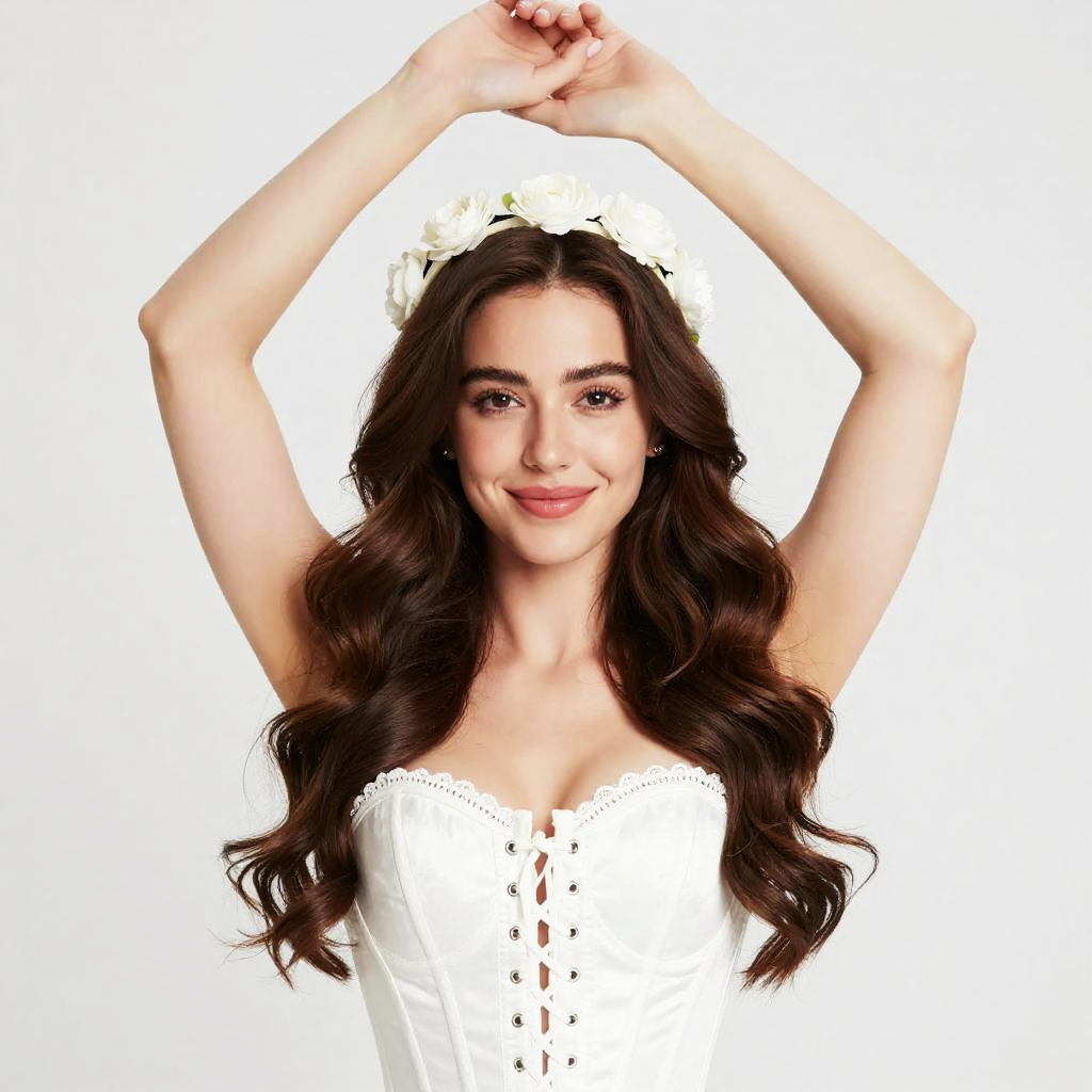Photograph of a young woman with long, wavy brown hair, wearing a white, strapless corset with lace-up detailing and a white floral headband. She has fair skin, light makeup, and a subtle smile. Her arms are raised above her head, hands clasped together. The background is pure white, making her the focal point. The lighting is bright and even, emphasizing her features and the texture of her hair and clothing. The image has a clean, studio-like quality with a polished, professional look.