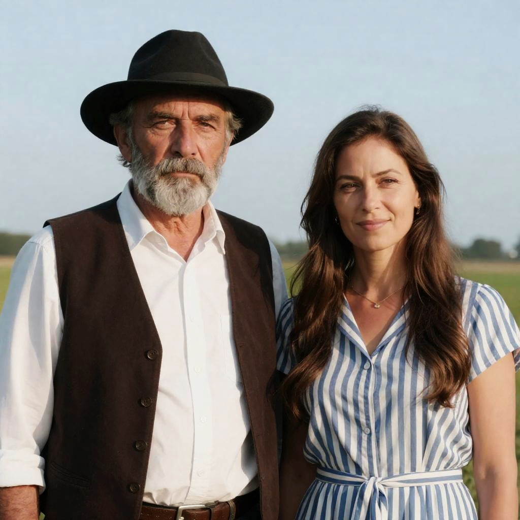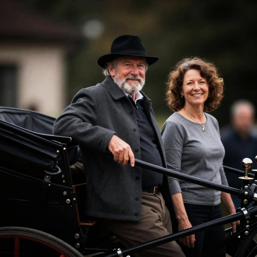 Photograph of an older white couple. Man with grey beard, black hat, grey jacket, leaning on horse-drawn carriage. Woman with curly brown hair, grey top, standing beside him. Both smiling. Carriage with black leather straps and metal hardware. Dark, circular vignette effect.