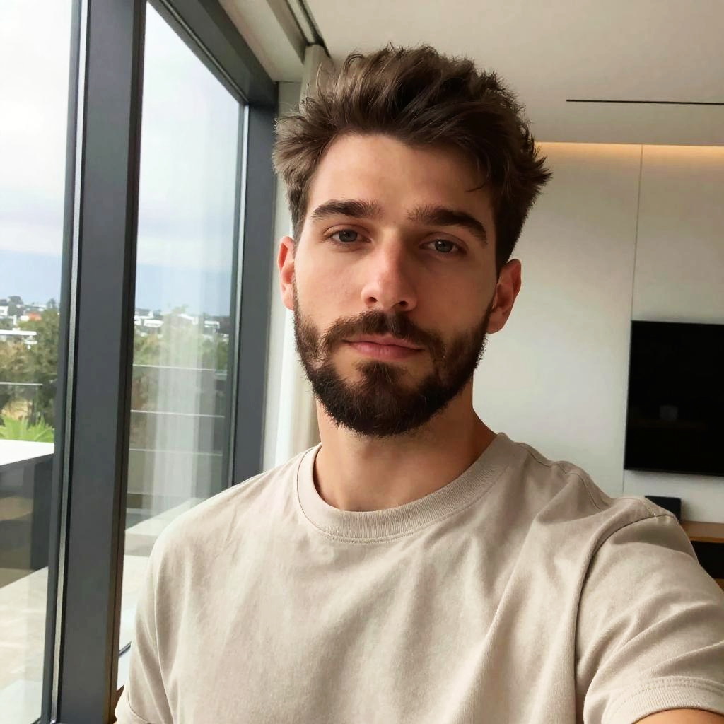Handsome guy selfie indoors near large window, diffused daylight softly illuminating clean skin and well-groomed beard, contemporary minimalist outfit, background featuring modern interior design with muted palette, warm inviting atmosphere with fine details and texture.