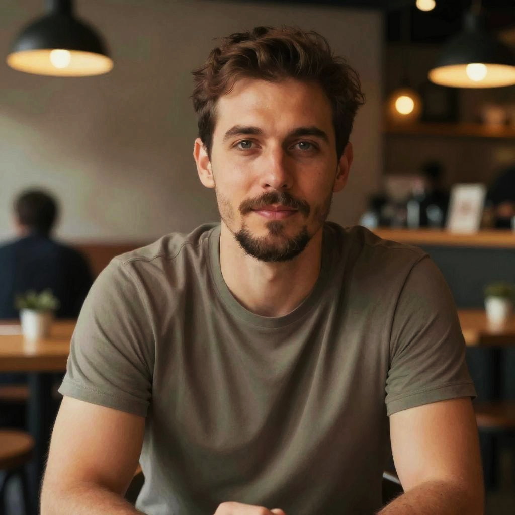Photograph of a handsome, bearded man with dark brown hair, wearing a beige t-shirt, standing in a sunlit modern room with large windows