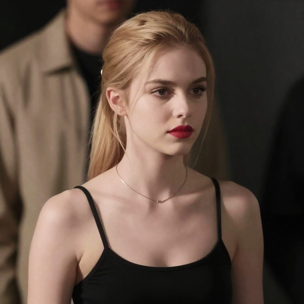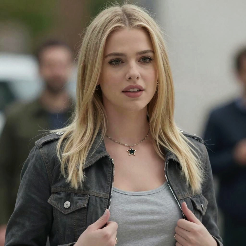 Portrait of a blonde woman wearing a grey shirt and a dark grey jacket with buttons. She has long straight hair parted in the middle, light skin, and is wearing a star-shaped necklace and small earrings. The background is blurred, focusing on the upper body of the woman who is looking slightly off-camera with parted lips.