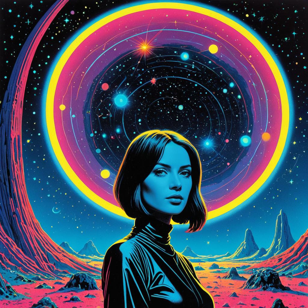 Cosmic girl, phosphorescent reverie, bright neon colors, highly detailed, cinematic, by Roger Dean