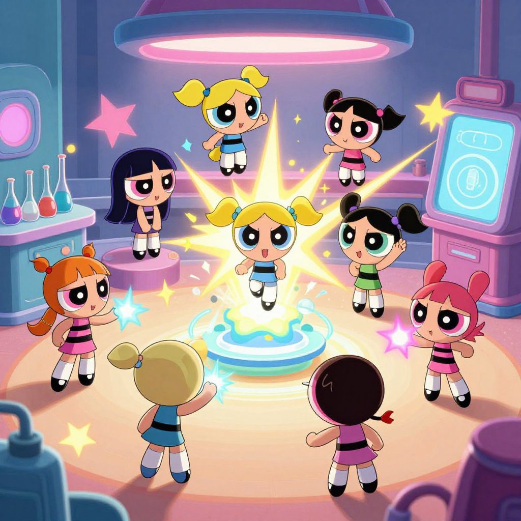 Powerpuff Girls maker concept art featuring youthful heroes assembling their costumes and powers in a whimsical laboratory, futuristic yet playful design, light and shadow contrasts, colorful sparks and creative energy swirling around
