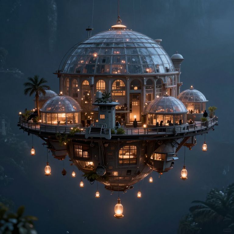 A floating city of suspended domes is powered by the dreams of its inhabitants, lit by lanterns filled with bottled constancy.