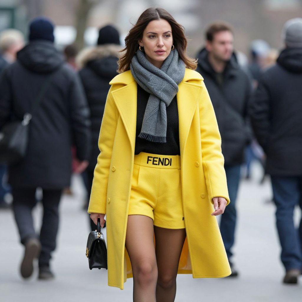 Woman walking confidently in a vibrant yellow Fendi ensemble, including shorts and a matching coat, while bundled up with a gray scarf against the winter cold on a bustling city street.