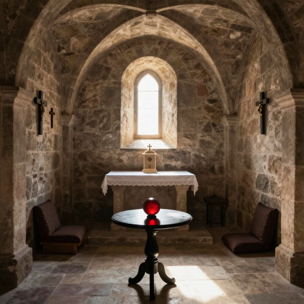 This is a photograph of a dimly lit, rustic stone chapel with arched ceilings. The foreground features a small, round, black table with a red orb and a dark brown, striped cushion on a low bench. Crosses hang on the left wall. Sunlight streams through a window in the background, illuminating a simple white altar. The stone floor and walls add a medieval feel.