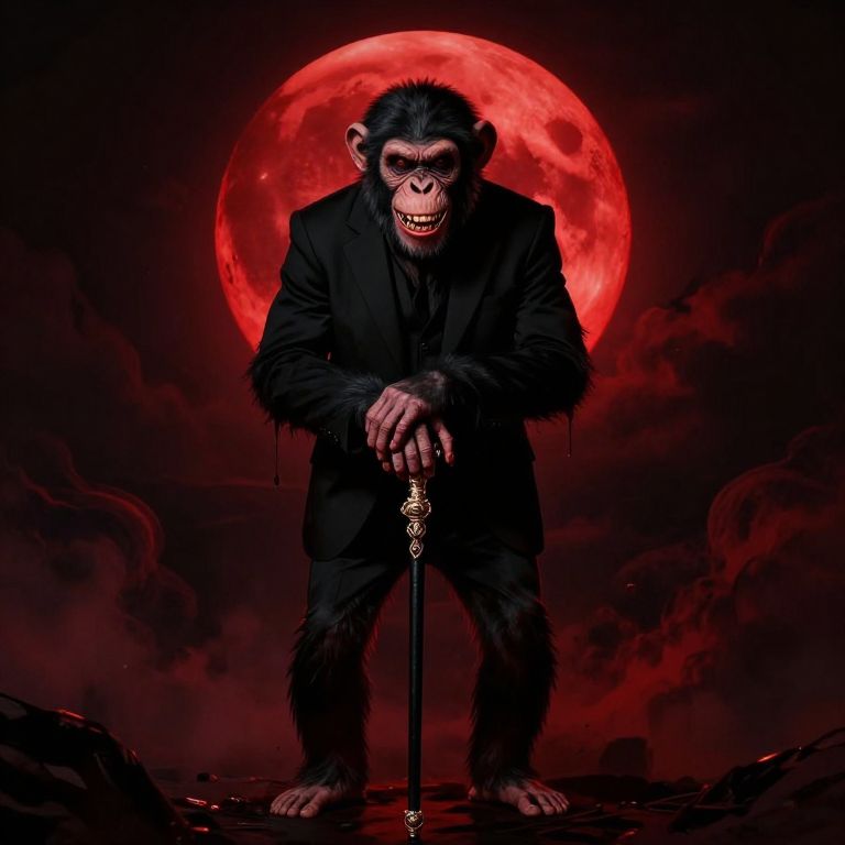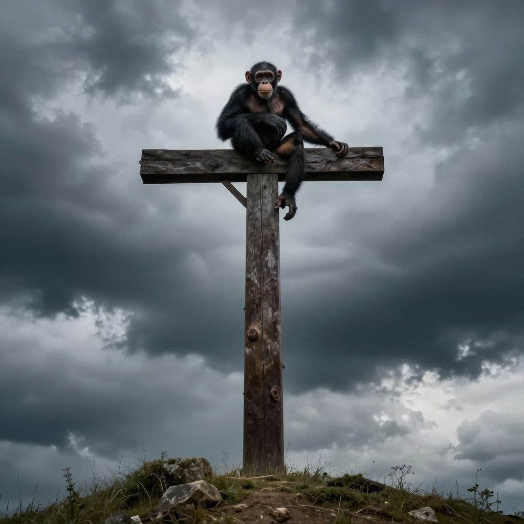 Photograph of a large, dark-furred monkey with a stern expression, sitting atop a tall, weathered wooden cross. The monkey is wearing a black leather cap and is positioned centrally against a dramatic, cloud-filled sky. The ground beneath the cross is grassy with scattered rocks. The clouds are dense and dark, creating a moody atmosphere. The wooden cross is textured and aged, standing out starkly against the cloudy background. The overall composition is striking and evocative, blending elements of nature and the surreal.