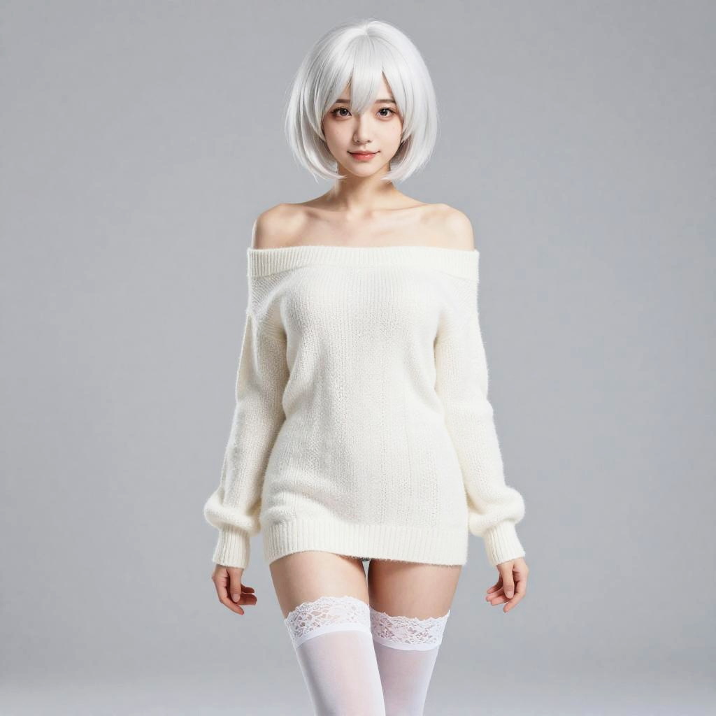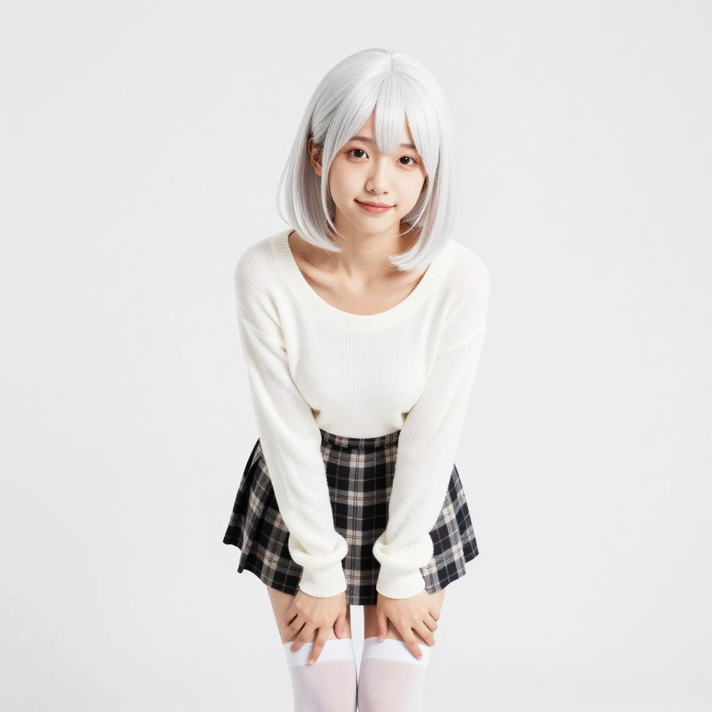 A digital CGI image of a cute, young Asian woman with pale skin and shoulder-length white hair. She's wearing a white, long-sleeve, ribbed sweater with a scoop neckline, a short plaid skirt, and white thigh-high stockings. She's standing against a plain white background, slightly leaning forward with her hands resting on her knees, giving a shy, gentle smile.
