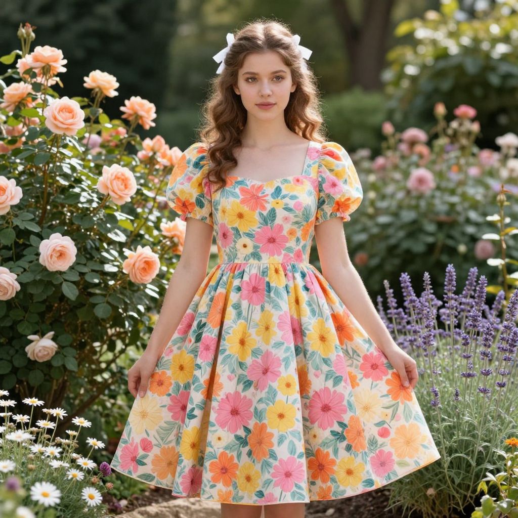 Photograph of a young woman standing in a vibrant garden. She has fair skin, wavy brown hair, and wears a colorful floral dress with a white bow in her hair. The dress has puffed sleeves and a full skirt, adorned with pink, yellow, and orange flowers. Surrounding her are blooming roses, lavender, and daisies, with sunlight filtering through trees in the background.