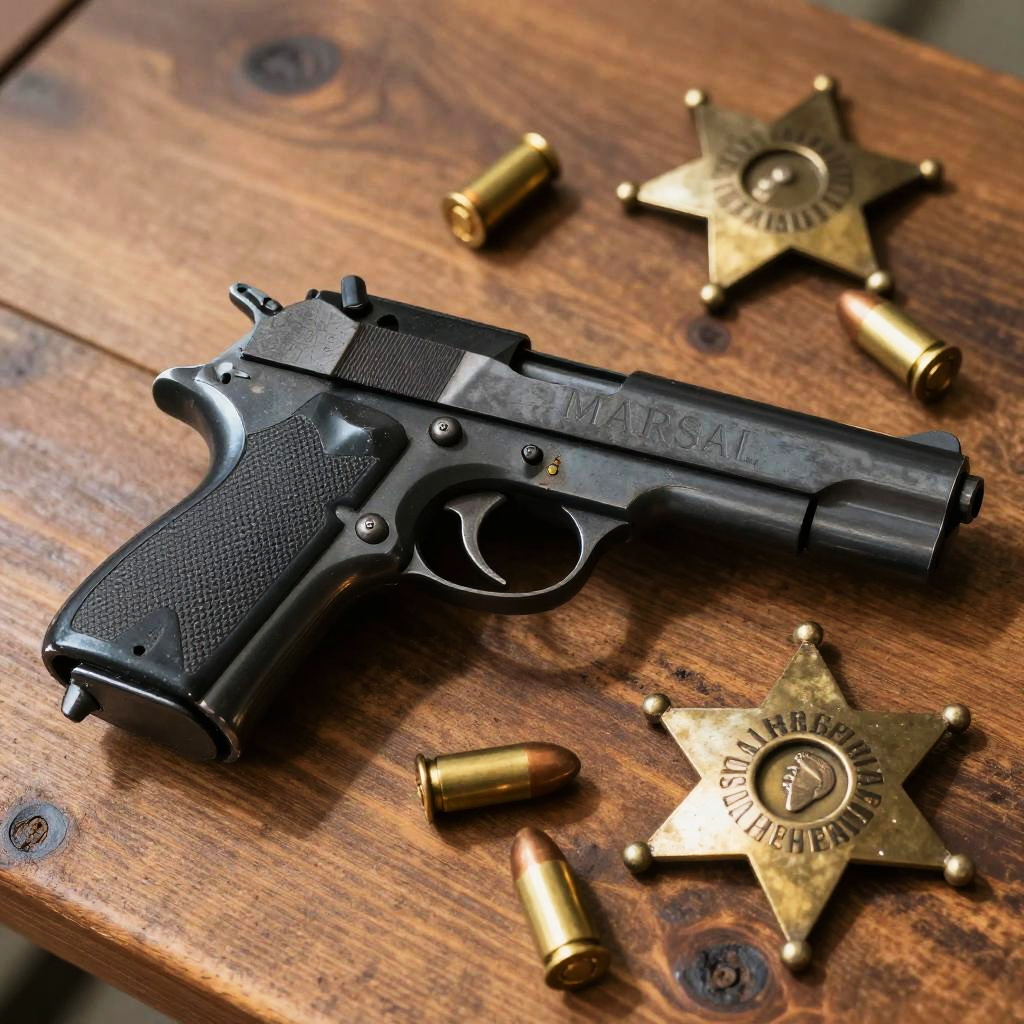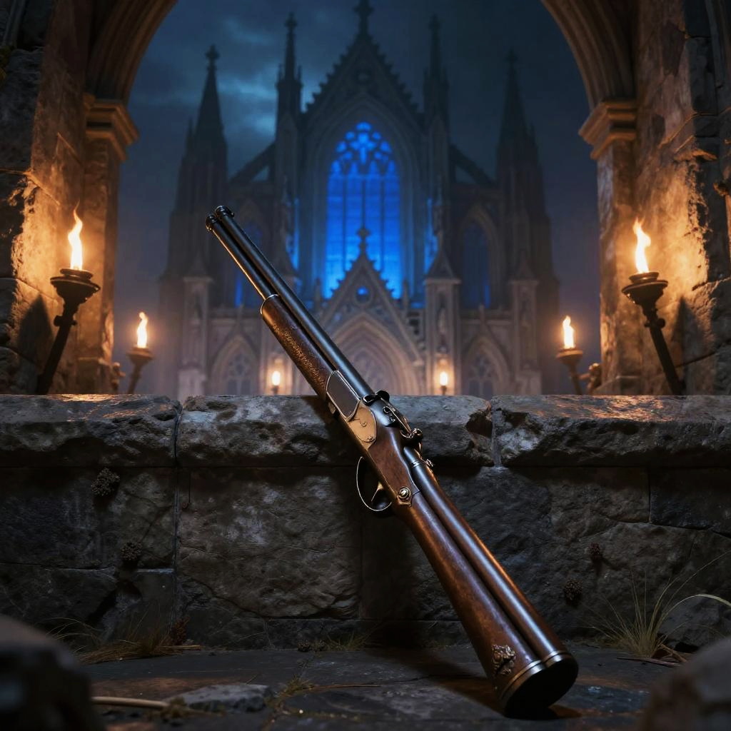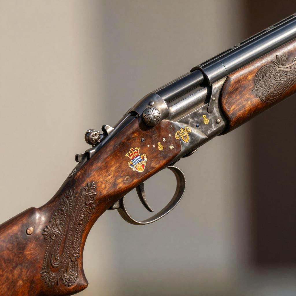 Close-up of a crusader shotgun with ornate carvings and royal insignias, weathered metal and wood textures, illuminated by soft sunlight, hyper-realistic style