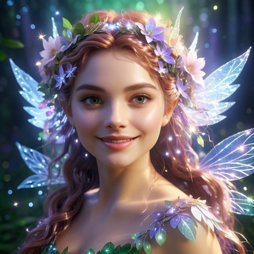 Portrait of a female fairy with sparkling wings, with flowers woven into her hair, smiling, fantasy CGI, inspired by A Midsummer Night's Dream.