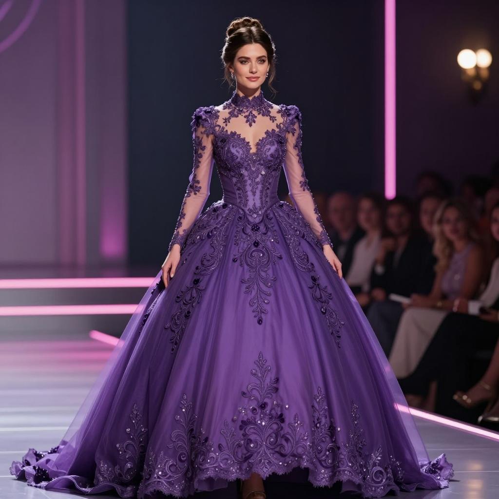 Beautiful golden gown, photorealistic, fashion model, golden Renaissance dress, V-neck, long sleeves, embroidered details, flowing skirt, woman with light brown hair in an updo, serious expression, sunlit cobblestone street, blurred background, another model in similar dress, warm sunlight, lamp post, historical European setting, detailed ures, elegant, sophisticated, high fashion, vintage style, elegant, soft lighting