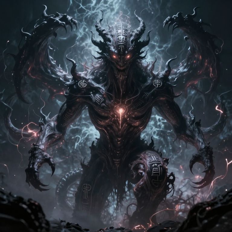 This digital artwork depicts a menacing, dark, humanoid demon with glowing red eyes and a glowing, triangular, light source on its chest. It has sharp, black, clawed hands, and large, jagged horns extending from its head. The demon's muscular, twisted body is surrounded by swirling, electric blue and purple lightning-like energy. Chinese characters are embedded in the energy and on its body. The background is a stormy, dark, and chaotic mix of blues and blacks, enhancing the demon's ominous presence. The overall style is highly detailed and dramatic, with a fantasy horror theme.