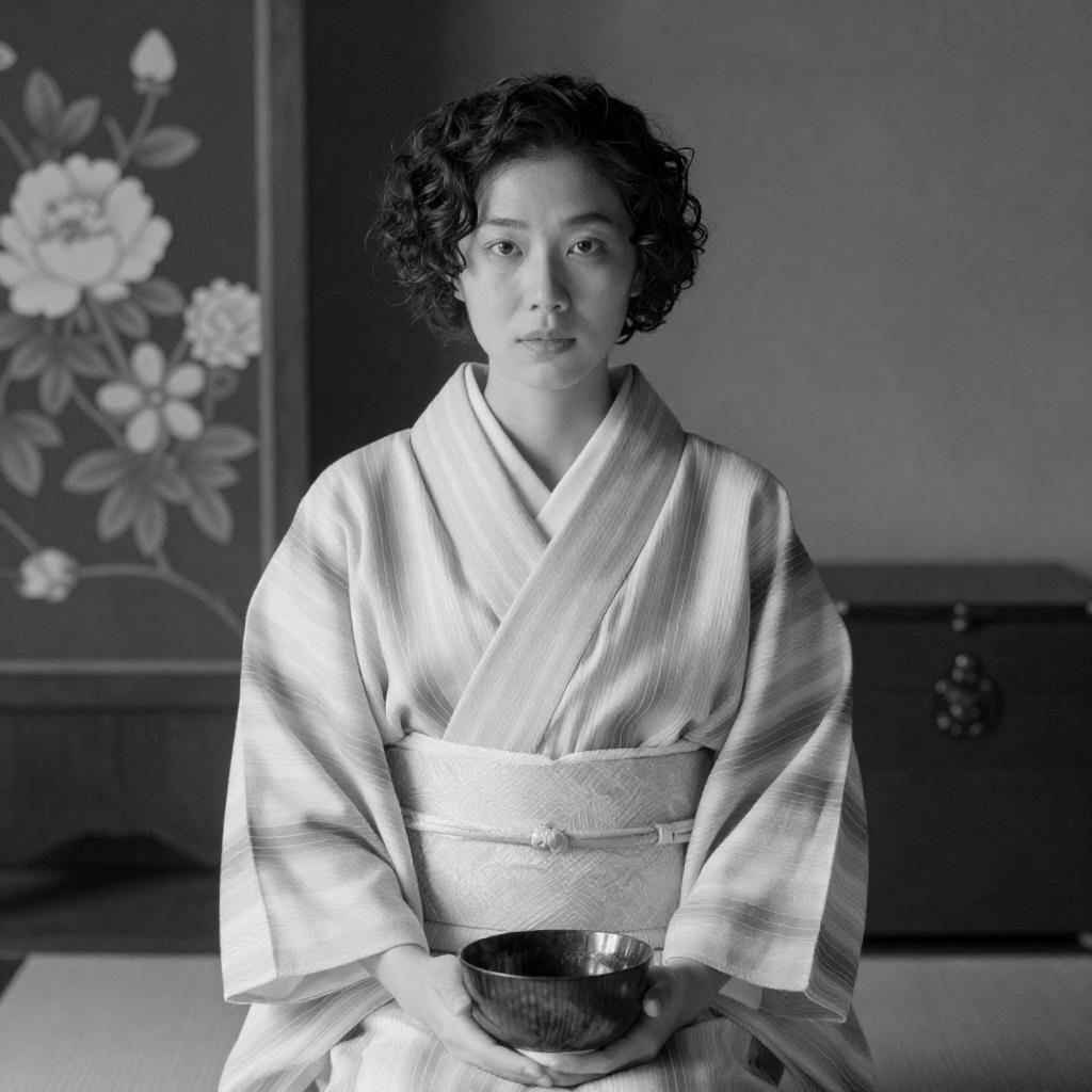 Black and white photograph of a young Asian woman with short, curly hair adorned with small hairpins. She looks down with a calm expression. She wears a patterned kimono with geometric designs. Background shows blurred windows and outdoor trees. She is centered, slightly turned to the side. Soft light illuminates her face.