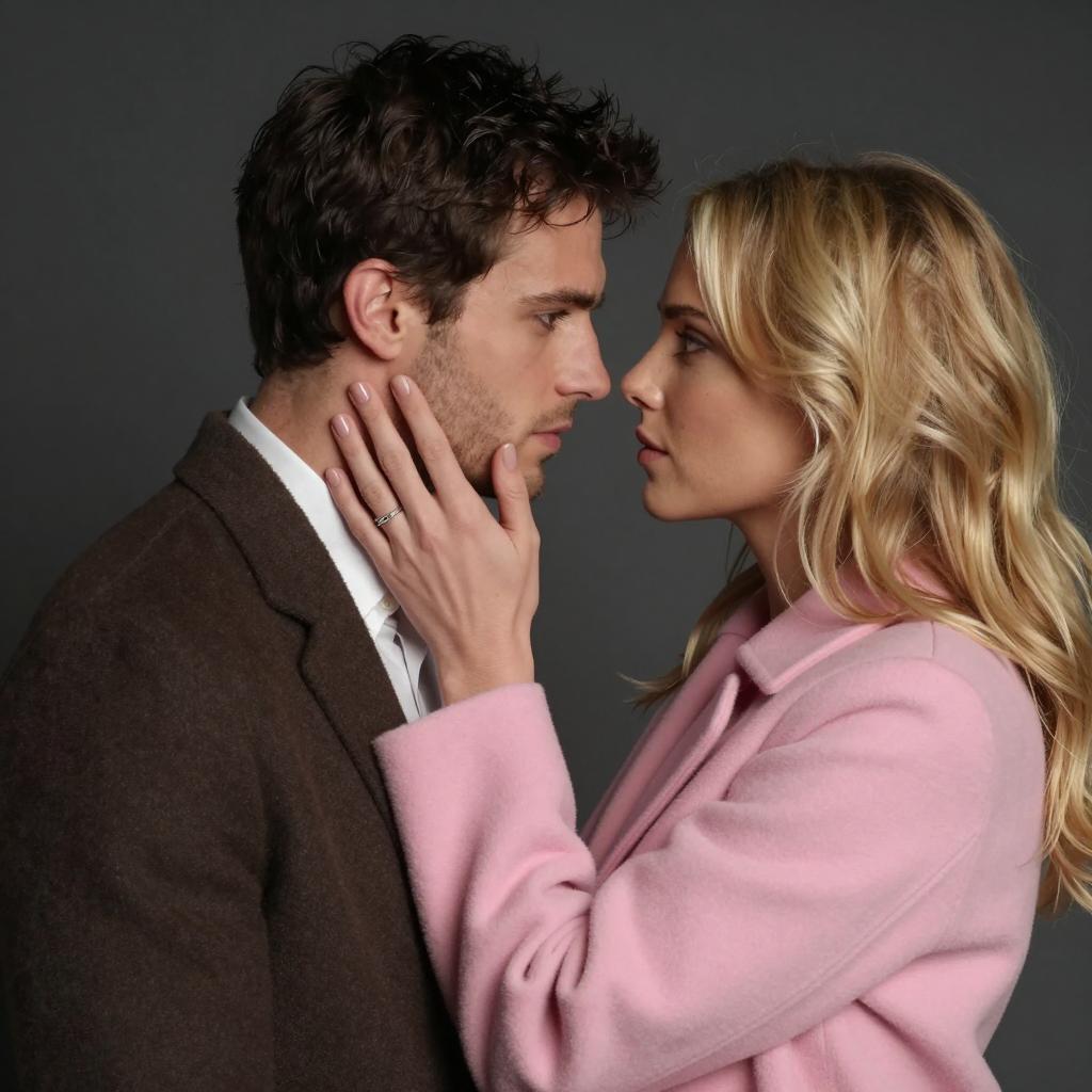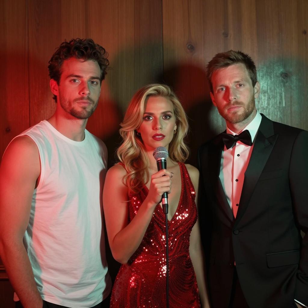 Photo of three adults in a dimly lit room with red and green lighting. A blonde woman wearing a red sequin dress holds a microphone in the center. To her left stands a man with curly brown hair in a white sleeveless shirt. To her right is a man with short light brown hair dressed in a black tuxedo with a bow tie. The background features wooden paneling. All three face forward with neutral expressions.