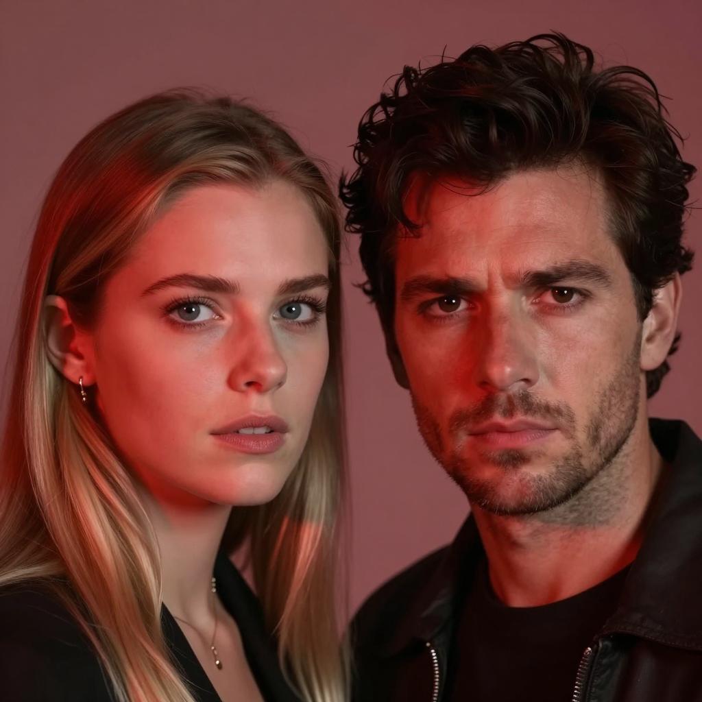 Photograph of three people in a dimly lit room with red and green lighting. Woman in red sequin dress holding a microphone, man in white sleeveless shirt to her left, man in black suit and bow tie to her right. Woman with blonde hair, men with short hair. Red light on woman's face, green light on men. Wooden panels in background. All three facing forward. Woman's expression is neutral, men's expressions are neutral.