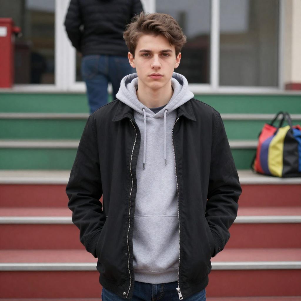 Photograph of a young man with light brown hair and glasses, wearing a blue and white sports jersey, looking slightly to the side. He stands in front of a gray wall with a wooden coat rack holding various colorful clothes, including blue, white, and red garments. The lighting is bright, highlighting his face and the clothes behind him.