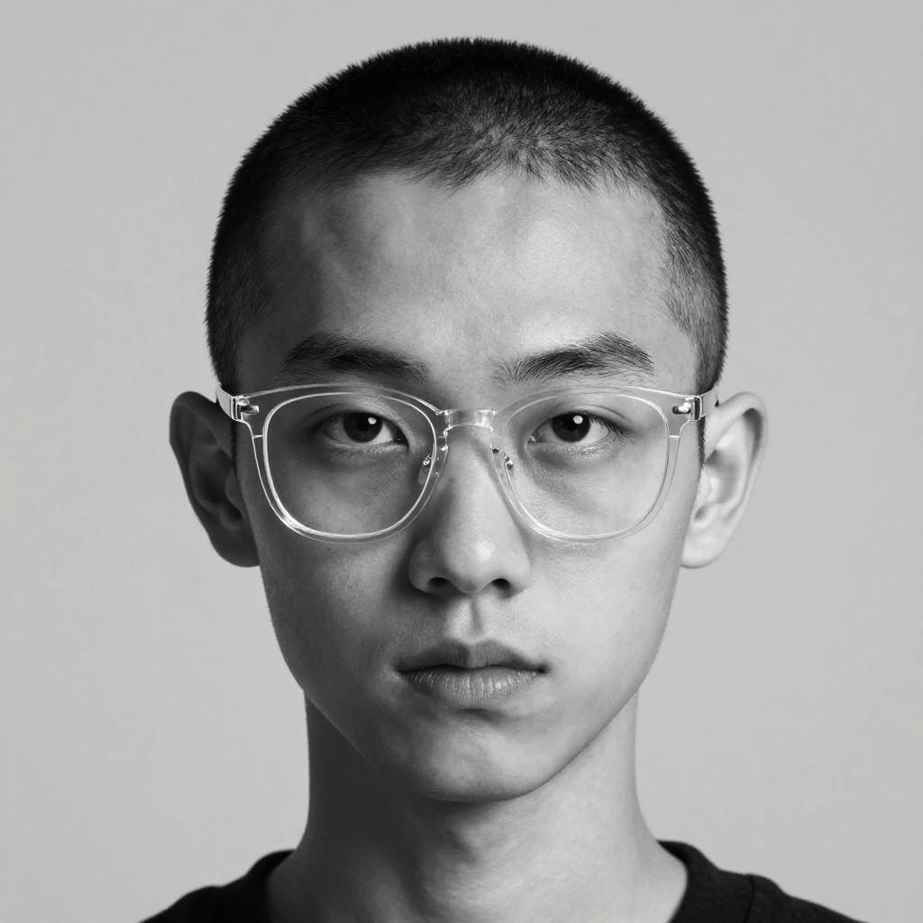 Buzzcut and glasses, a modern urban portrait of a confident young person with a sharp buzzcut hairstyle and stylish round glasses, wearing a sleek bomber jacket against a vibrant cityscape at dusk, neon lights reflecting off their glasses