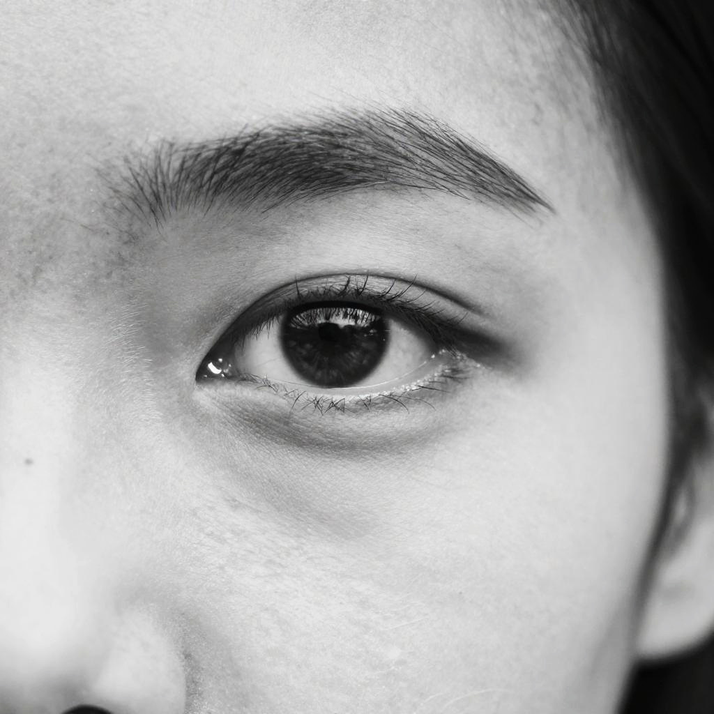 Monochrome eye portrait, half face painted in grayscale, soft focused lines, intense gaze, monochromatic color palette with deep blacks and bright whites, fine art photography style, abstract textures around the eye