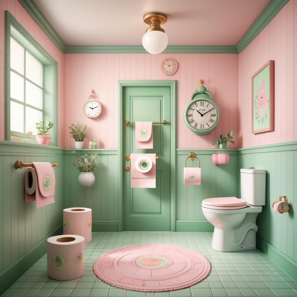A cute cartoon pig character standing in a warmly lit bathroom with pink tiled walls and a green door, soft pastel color palette including pinks, greens, and creams, cheerful and friendly mood, whimsical and playful style, detailed indoor scene with toilet paper rolls, a sink, a smiling clock hanging on the door, and decorative elements like hanging clouds and light bulbs, digital illustration with smooth shading and vibrant colors