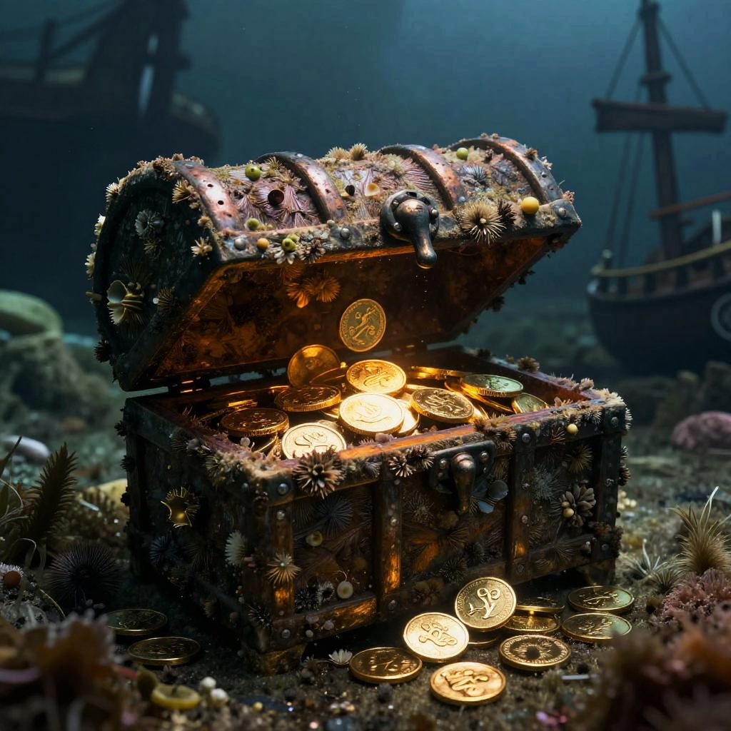 Underwater pirate shipwreck covered in barnacles and seaweed, eerie and mysterious atmosphere, glowing treasure chest spilling gold coins, detailed textures, photorealistic style