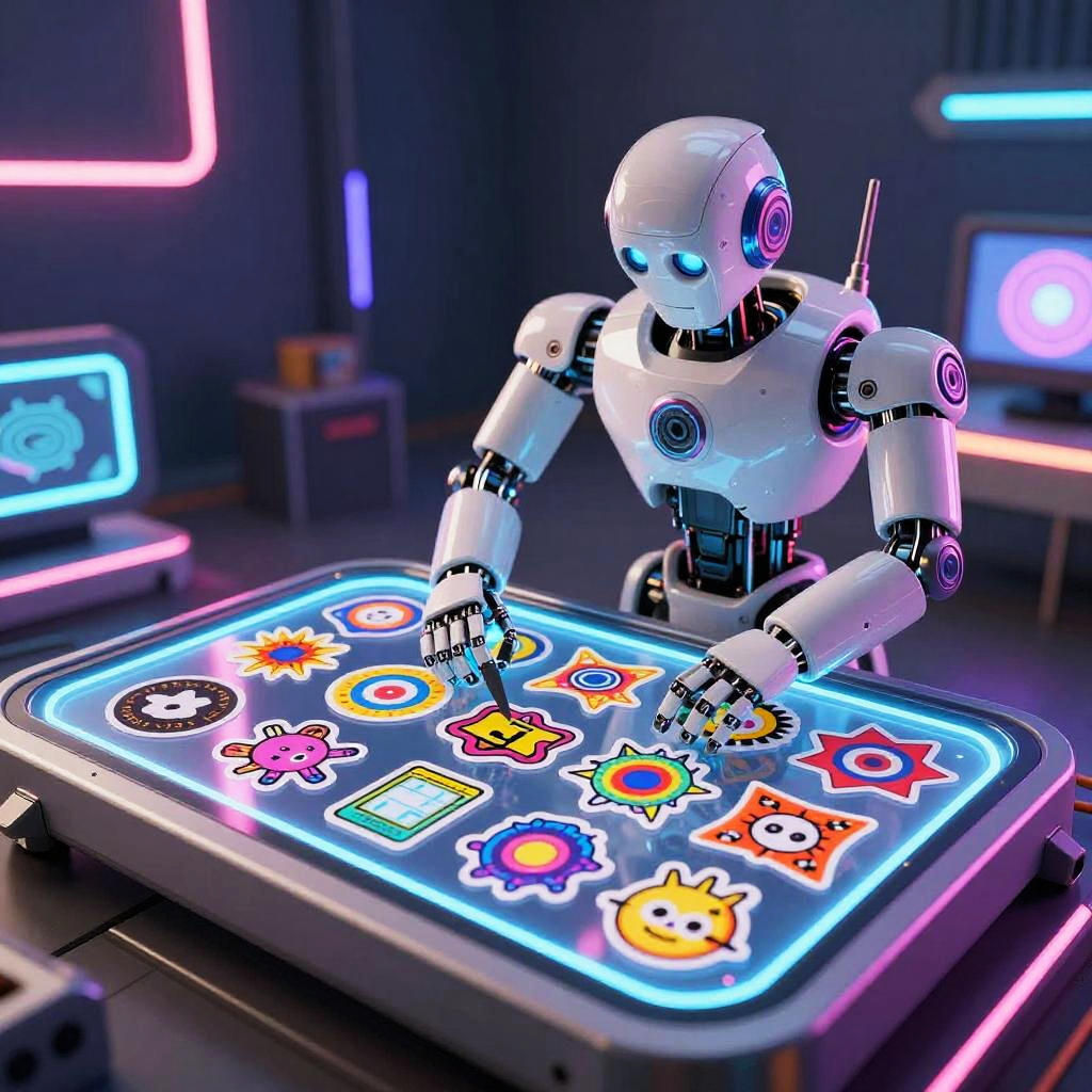 Sticker AI generator concept, futuristic robot creating vibrant and colorful digital stickers on a holographic touchscreen, neon lights reflecting on sleek surfaces, dynamic composition with tech-inspired background, vivid and modern art style