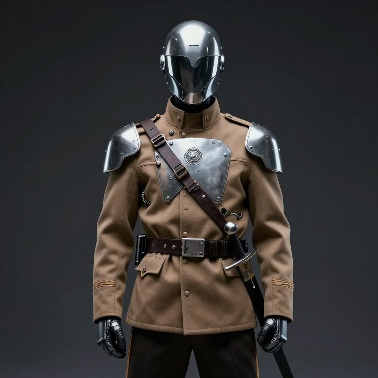 Photograph of a mannequin dressed in a futuristic, armored military uniform. The uniform is tan with black buttons and a black belt with a large square buckle. The mannequin wears shiny, silver shoulder armor and a black, glossy helmet with a visor. A diagonal, silver chest plate with a circular emblem is also visible. A dark brown strap crosses the chest. The mannequin's hands are gloved in black. The background is a solid, dark gradient, emphasizing the uniform's details. The overall style is sleek and modern, reminiscent of sci-fi or futuristic military design.