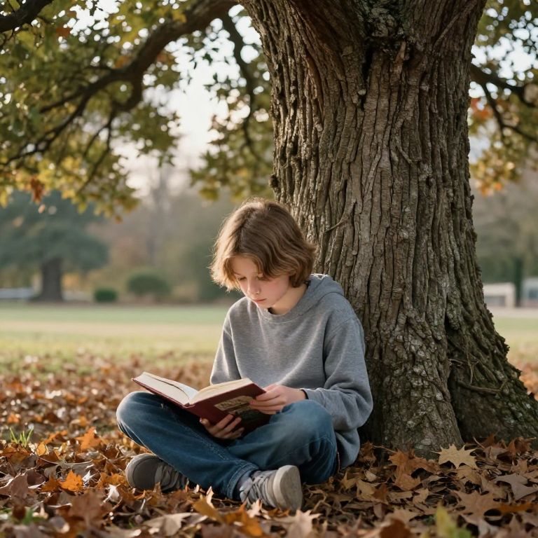 12 year old boy with long hair sitting cross-legged reading a book under a large oak tree, surrounded by scattered leaves, soft afternoon sunlight, cozy and serene atmosphere