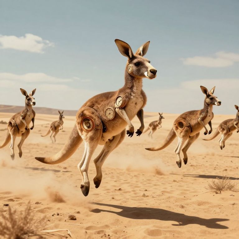 Amidst a surreal desert landscape where time itself seems to pulse and breathe, clockwork kangaroos leap through an endless expanse of forgotten moments, embodying the relentless march of progress and the poignant beauty of lost eras.