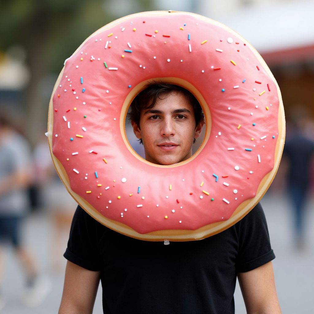 "mexican donut costume, 1boy, male focus, solo, shirt, looking at viewer, food, sprinkles, short sleeves, black shirt, doughnut, upper body, blurry, blurry background, outdoors Realistic photo of casual sexy person with pretty face"