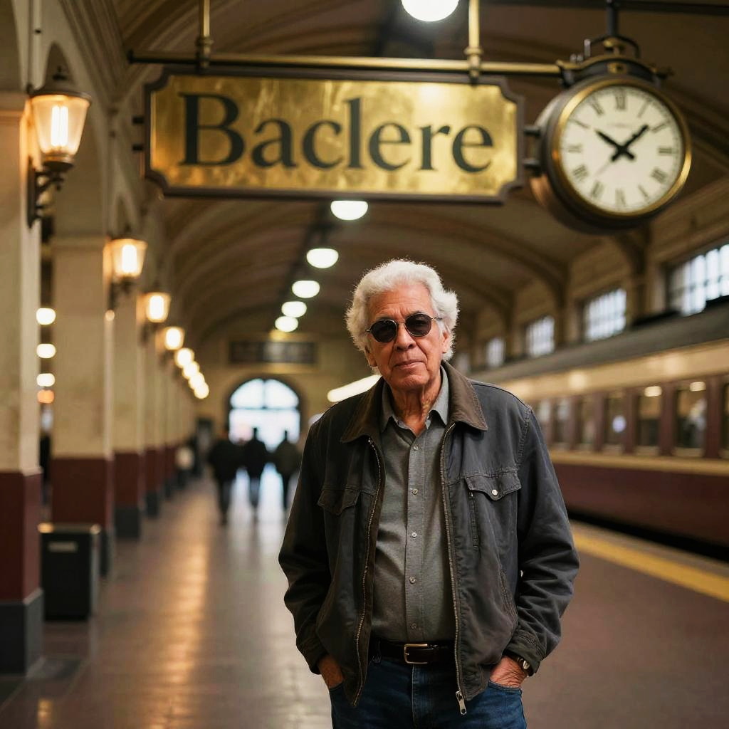 A retired jazz musician confidently posing in a historic train station, adorned with brass signage, vintage clocks, and Edison bulbs and soft lighting, creating a captivating atmosphere.