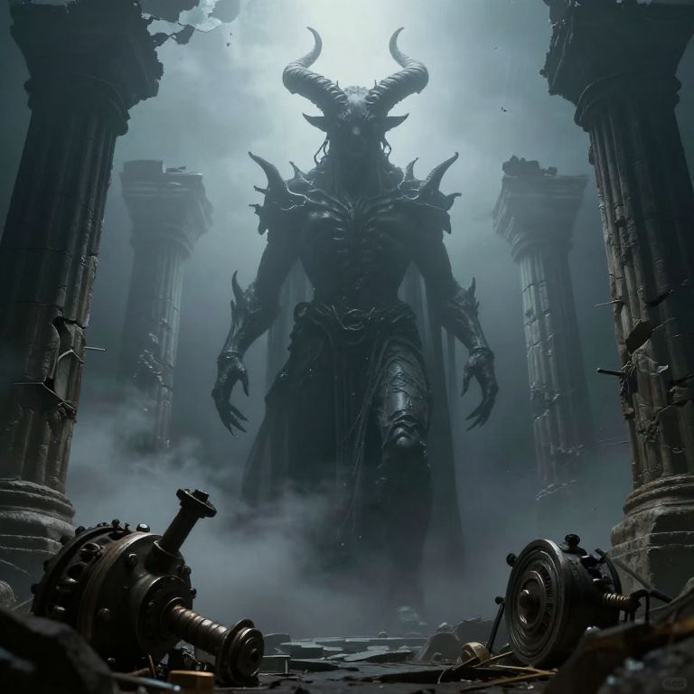 Sentient fog cloaks the towering figure of a dark, horned entity amidst crumbling stone pillars, its eerie glow illuminating the misty ruins where ancient mechanisms lie dormant.
