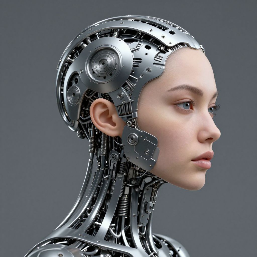 This is a CGI digital artwork of a young woman with light skin and a focused expression, depicted in a profile view against a solid gray background. Her head and neck are entirely mechanical, covered in intricate, silver metallic gears, wires, and circuits, resembling futuristic cybernetic enhancements. Her smooth, human facial features contrast with the mechanical elements, highlighting the blend of human and machine. The metallic parts have a shiny, reflective surface with various textures, including gears, screws, and circuit boards. Her eyes are blue, and her lips are slightly parted. The overall style is realistic with a sci-fi theme, emphasizing the intersection of human and technology.