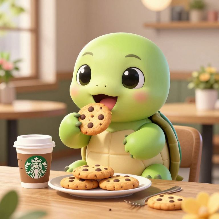 Irony cute smiling baby turtle eating starbucks coffee and pixar style cookies for breakfast, sunny cafe, flowers, ultra detailed, volumetric, 3d 12k,