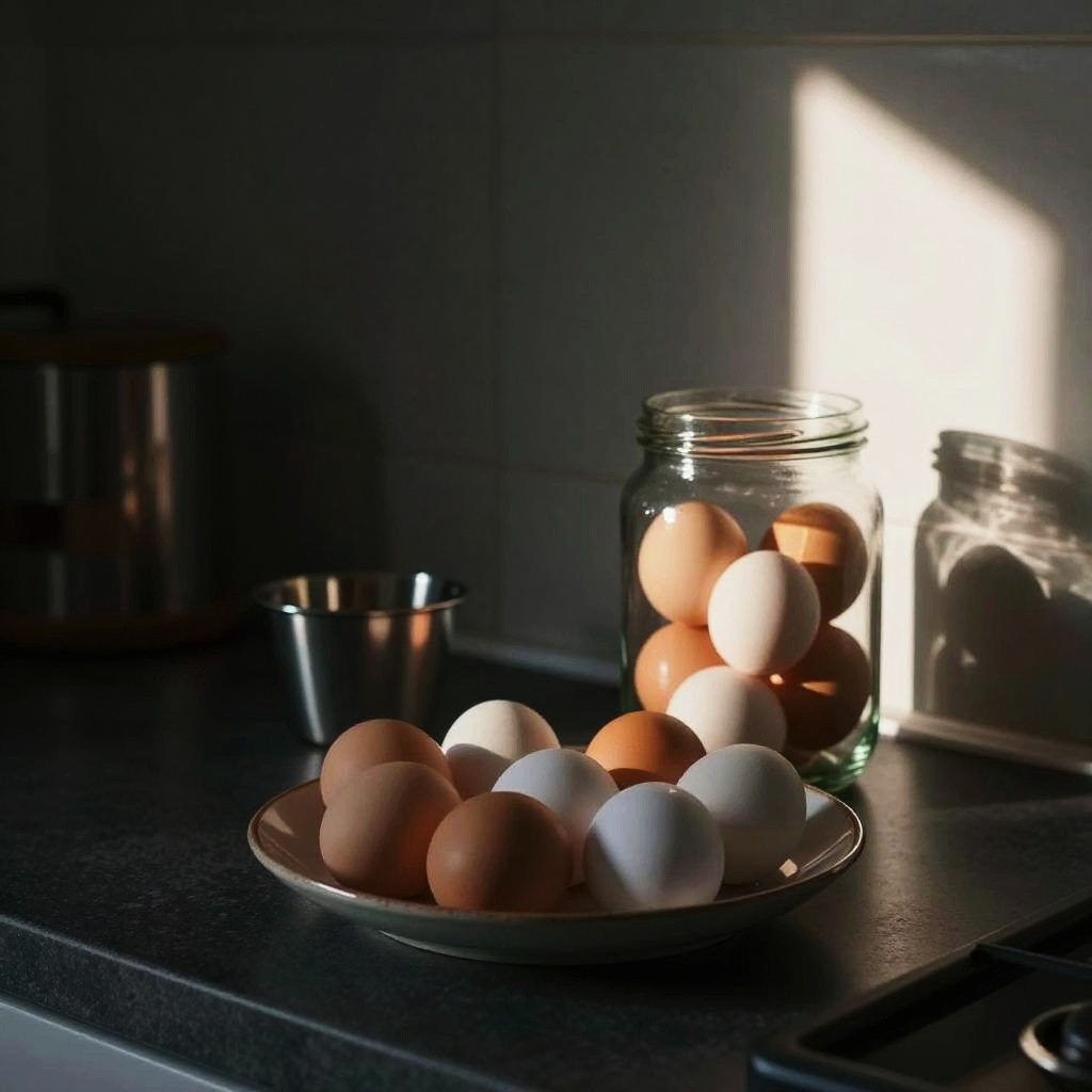 A moody photograph of a dimly lit kitchen counter. In the foreground, a plate of brown and white eggs sits on a dark surface. Behind it, a clear glass jar filled with more eggs and a small metal cup are positioned. The background is shadowy with a bright light source reflecting off a mirror, creating a dramatic, almost cinematic effect.