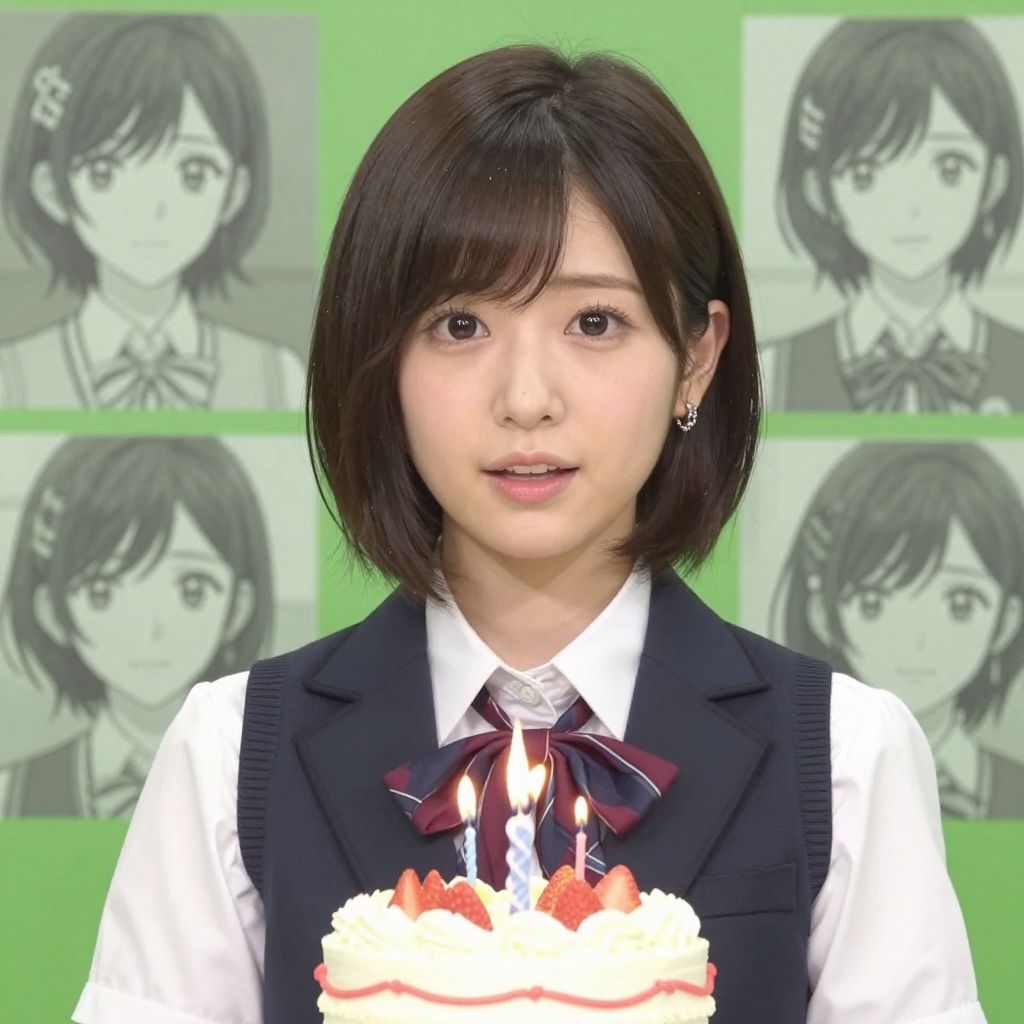 Asian woman with short black hair, wearing a black school blazer, singing into a microphone, holding a strawberry-topped cake. Green background. Photograph