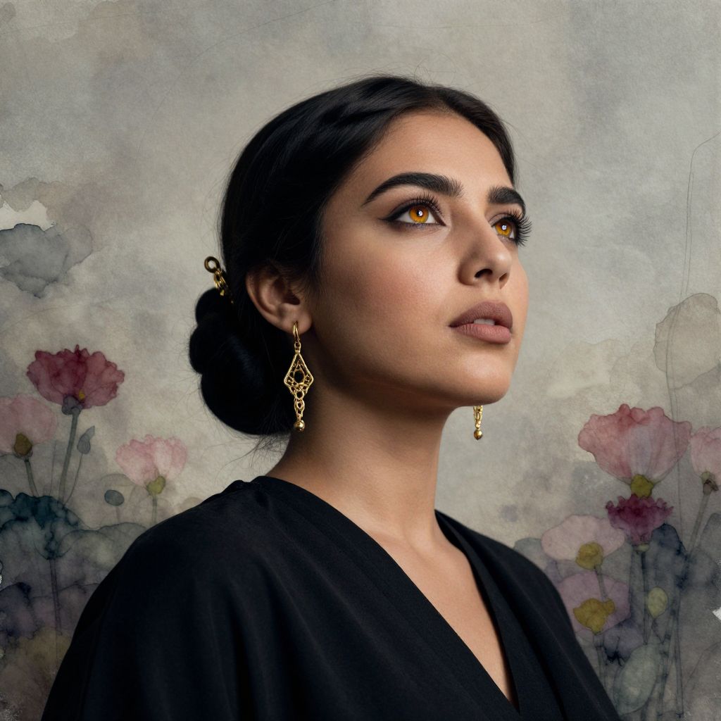 A DSLR portrait captures an enigmatic Middle Eastern woman with captivating amber eyes, olive skin, and sleek dark hair styled in a sophisticated updo adorned with gold jewelry. Against an ethereal backdrop of abstract watercolor strokes and surreal floral elements, she gazes pensively into the distance from a low-angle perspective. Her expression exudes quiet strength and inner contemplation, evoking intrigue and serenity while maintaining a profound connection to her cultural heritage.