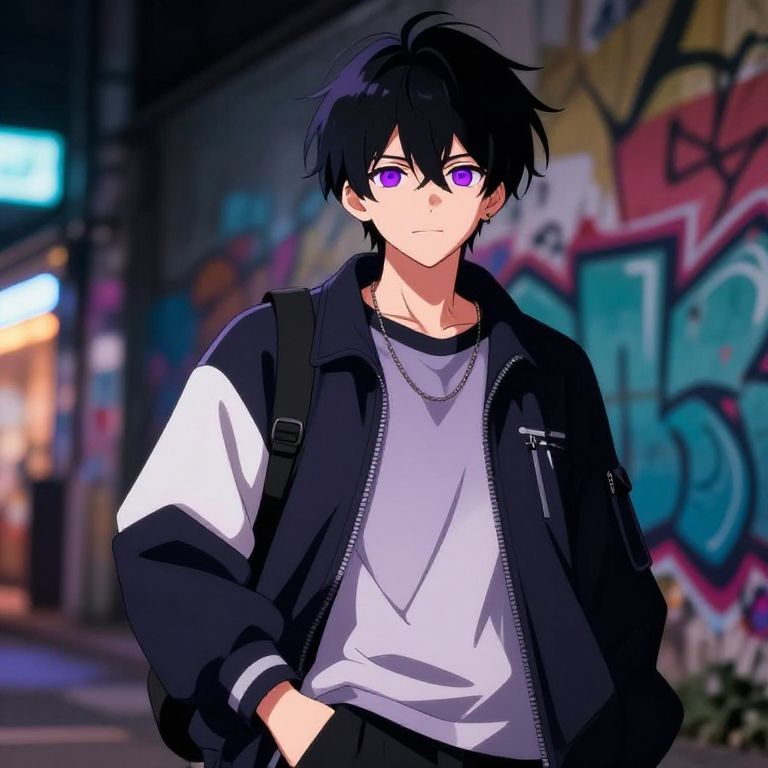 Anime boy with black hair and purple eyes wearing a modern streetwear outfit, graffiti walls behind him, urban night scene with colorful street lights, confident stance, subtle smirk, detailed textures on clothing and hair with wind effect.