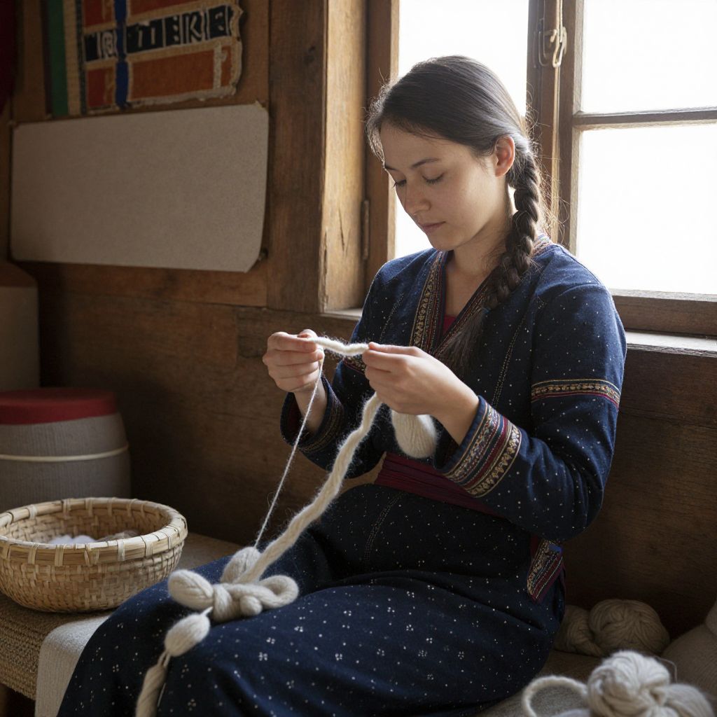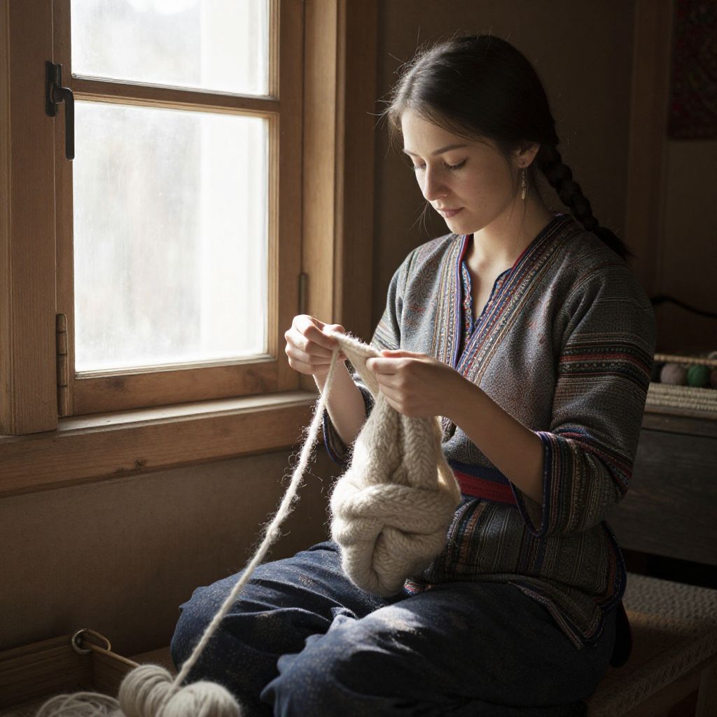 Woman seated by a window, skillfully spinning wool with a serene focus, her hands deftly manipulating the soft, fluffy fibers as sunlight streams through the wooden frame, illuminating her traditional attire and the rustic charm of the room.