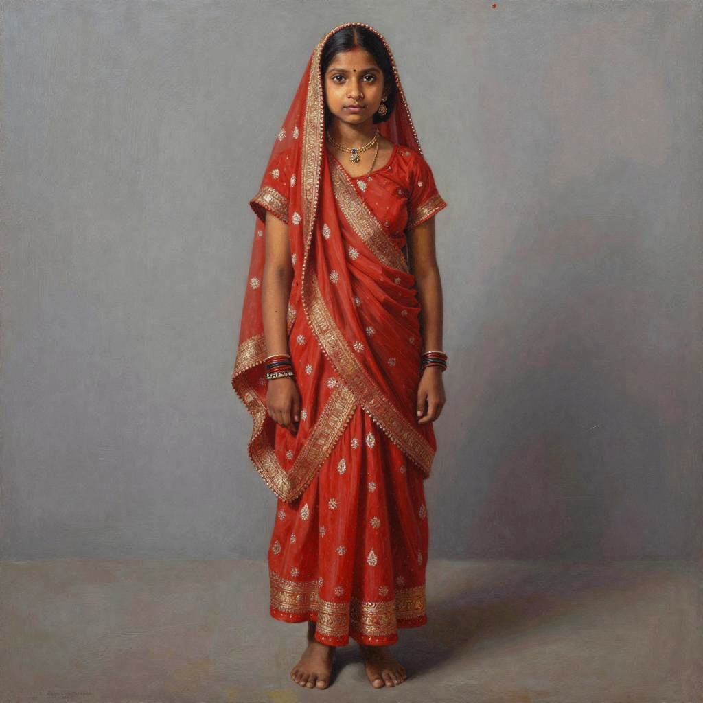 Photorealistic painting of a young Indian woman with long dark hair and brown eyes. She is wearing a traditional maroon garment with golden embroidered details. The portrait is a mid shot, capturing the neutral expression on her face against a plain background.