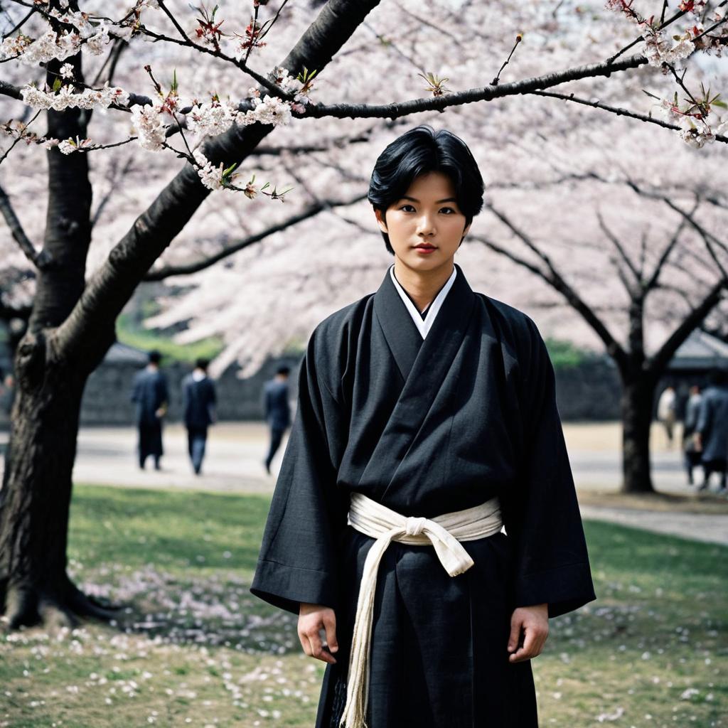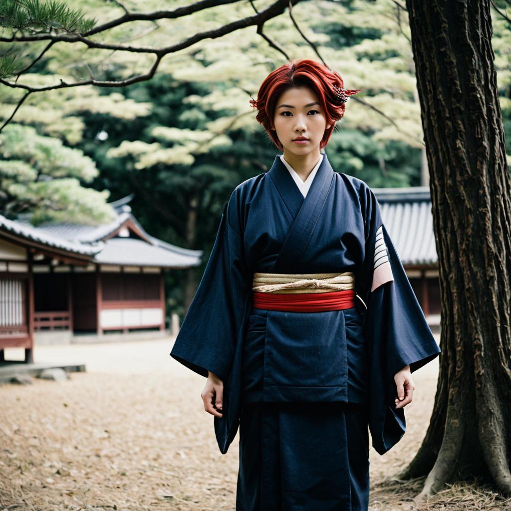 Young Asian woman with red hair wearing a dark blue traditional Japanese kimono with a beige and red obi belt, standing outdoors in a serene garden setting with Japanese-style buildings and pine trees in the background.