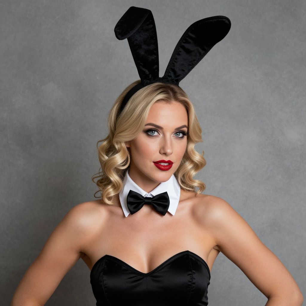 Photograph of a blonde woman with curled hair, wearing a black strapless bunny outfit, bow tie, black bunny ears, and red lipstick, against