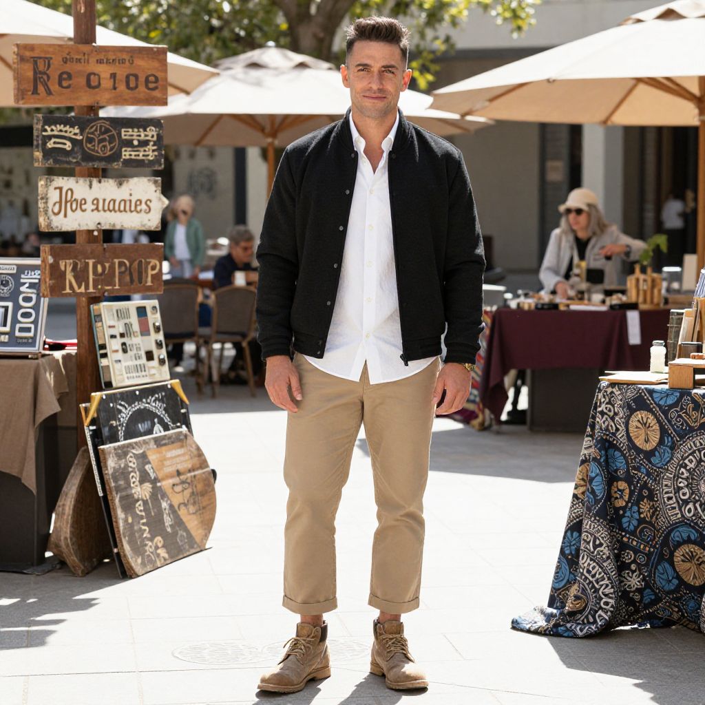 A man, black urban explorer varsity jacket, fitted white button-up shirt, cropped khaki chinos, stylish desert boots, sun-drenched plaza, rustic wooden signs, eclectic mix of handmade goods, 3M analog film stock, relaxed smile, confident demeanor. Man has masculine face and piercing eyes