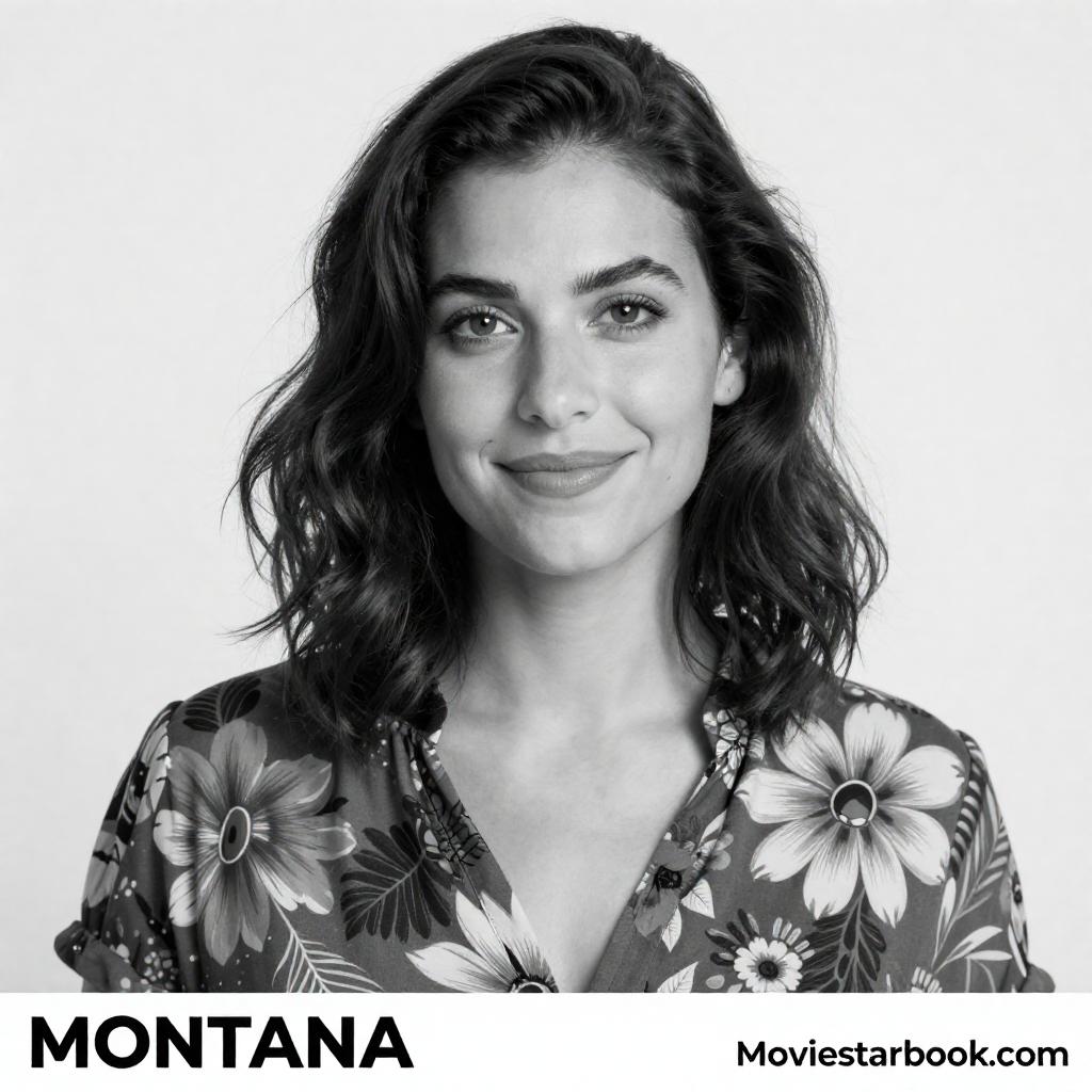 Black and white close-up portrait of a young woman with medium-length wavy dark hair wearing a floral-patterned blouse. She has light makeup and a slight smile, positioned against a plain white background. The image has text at the bottom reading 'MONTANA' and 'Moviestarbook.com.'